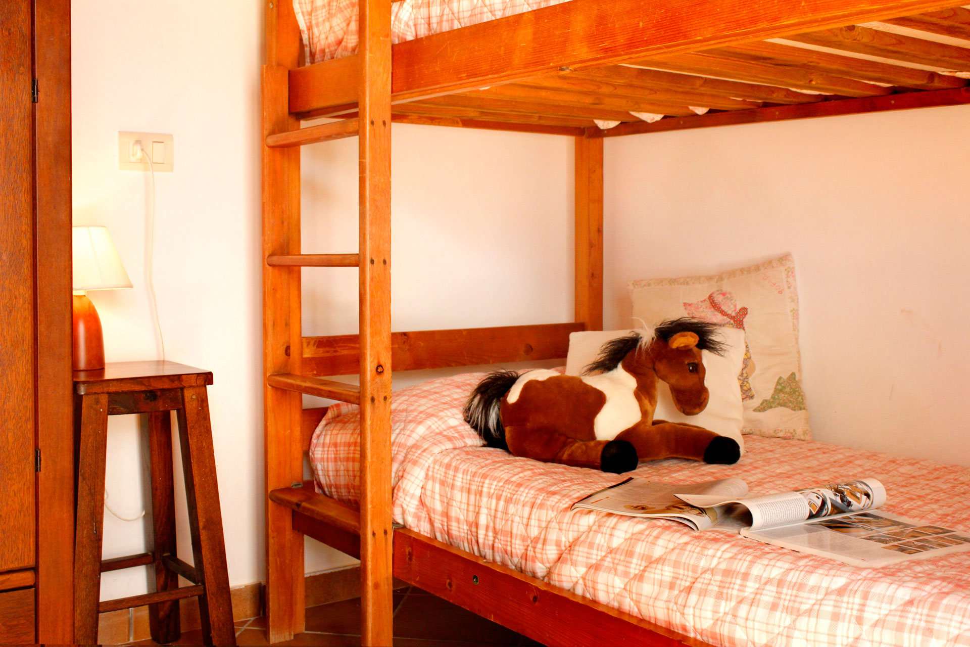 Im Erdgeschoss befinden sich das Doppelzimmer mit schmiedeeisernem Bett und geräumigen Massivholzschrank, das zweite Schlafzimmer mit Etagenbett und großem Kleiderschrank und das Badezimmer mit Dusche, Waschbecken, WC und Bidet.